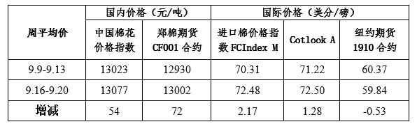 上周(9月16-20日),美國公布對中國進(jìn)口商品豁免關(guān)稅清單,國內(nèi)棉價(jià)穩(wěn)中有漲;國際價(jià)格則因美棉出口數(shù)據(jù)不佳而下跌。9月20日中國棉花價(jià)格指數(shù)CCIndex(3128B)收于13036元/噸,全周上漲5元;進(jìn)口棉價(jià)格指數(shù)FCIndexM為71.59美分/磅,1%關(guān)稅折人民幣12438元/噸,較中國棉花價(jià)格指數(shù)CCIndex(3128B)低598元,滑準(zhǔn)稅折人民幣14001元/噸,較中國棉花價(jià)格指數(shù)CCIndex(3128B)高965元,全周上漲1.06美分;鄭州商品交易所棉花主力合約CF001收于12950元/噸,全周下降25元。CotlookA指數(shù)收于71.25美分/磅,全周下降2.3美分;ICE棉花期貨近期合約收于59.13美分/磅,全周下降2.5美分。