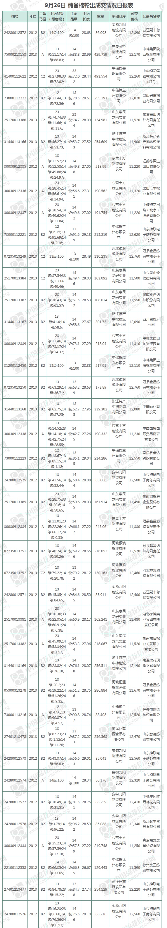 9月26日儲(chǔ)備棉輪出銷售資源11052.8974噸,實(shí)際成交7752.612噸,成交率70.14%,成交均價(jià)12001元/噸,較25日上漲50元/噸;折3128價(jià)格13186元/噸,較25日上漲44元/噸。