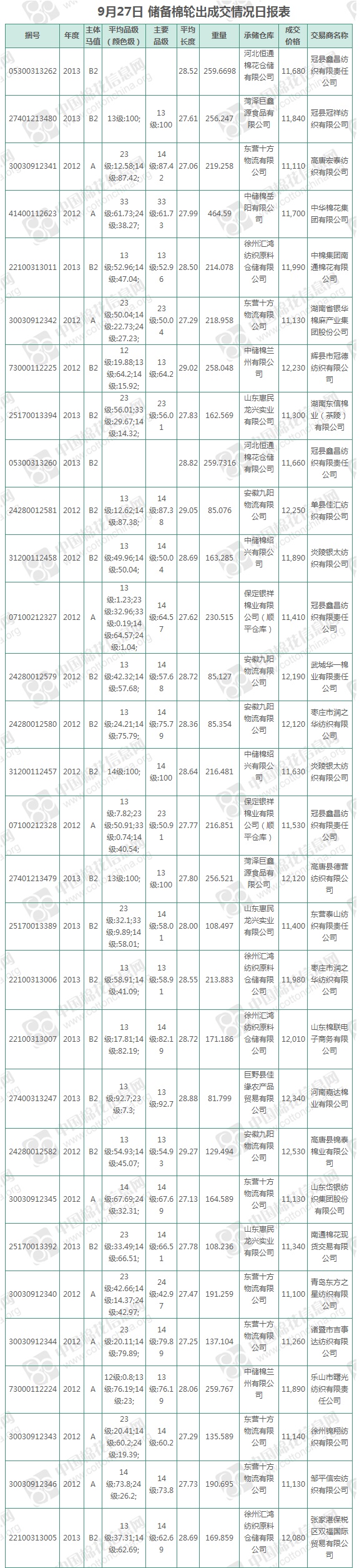9月27日儲備棉輪出銷售資源10209.3374噸,實際成交5714.3164噸,成交率55.97%,成交均價11684元/噸,較26日下跌317元/噸;折3128價格12929元/噸,較26日下跌257元/噸。