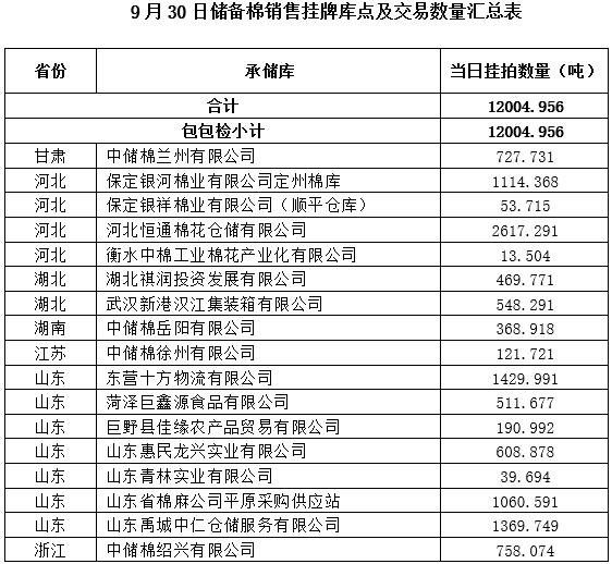 中國儲備棉管理有限公司定于9月30日上市銷售儲備棉重量12004.956噸,共61捆。