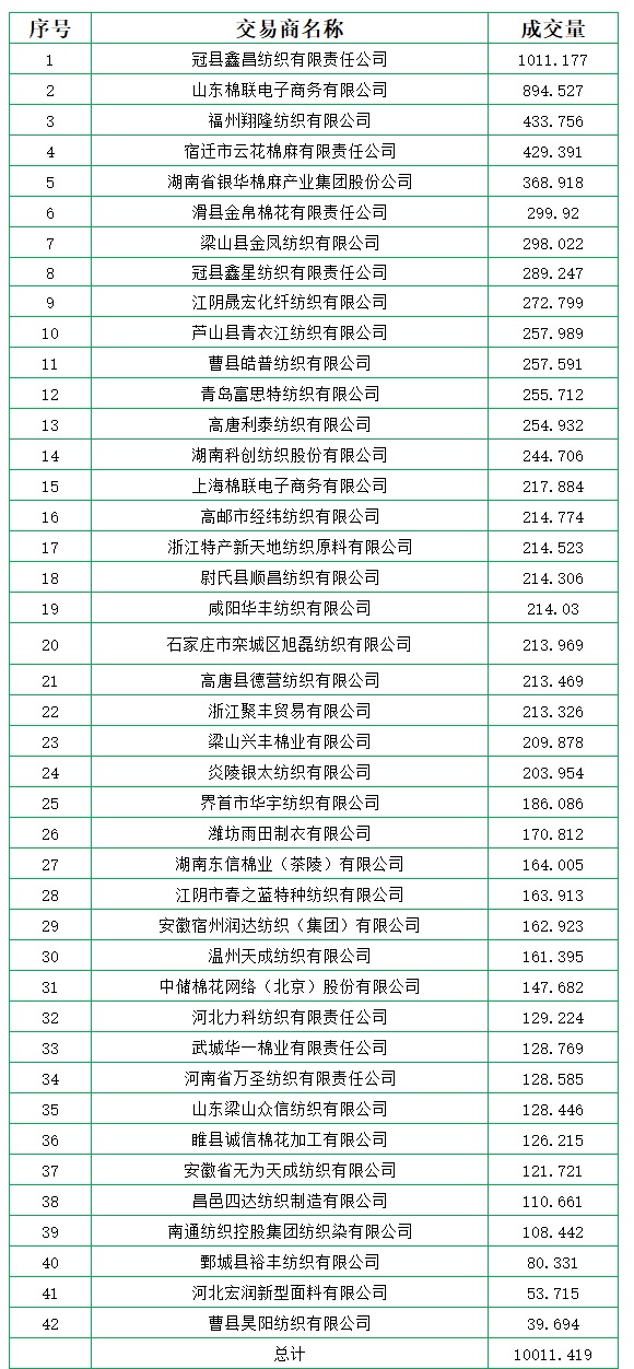 新疆棉成交均價(jià)11880元/噸,新疆棉折3128價(jià)格13252元/噸,新疆棉加價(jià)幅度670元/噸。