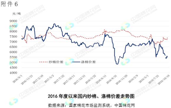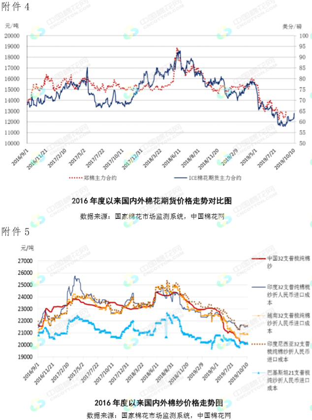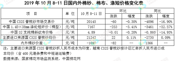 國內(nèi)棉花市場謹(jǐn)慎為主。據(jù)國家統(tǒng)計局?jǐn)?shù)據(jù)顯示,8月規(guī)模以上紡織業(yè)工業(yè)增加值同比增加0.1,%,增速環(huán)比下降1.1個百分點(diǎn),8月紡織業(yè)出口交貨值同比下降5.8個百分點(diǎn),自5月以來連續(xù)4個月負(fù)增長,中美貿(mào)易摩擦已對紡織行業(yè)造成沖擊。國內(nèi)棉花市場方面,據(jù)國家棉花市場監(jiān)測系統(tǒng)調(diào)查數(shù)據(jù)顯示,2019/20年度國內(nèi)棉花總產(chǎn)量預(yù)計616萬噸,同比增長0.9%。截至2019年10月11日全國新棉采摘進(jìn)度29.7%,累計交售籽棉折皮棉114.6萬噸,其中新疆103.9萬噸,加工率30%。節(jié)后籽棉收購價有所上漲,北疆部分地區(qū)機(jī)采棉收購價較節(jié)前上漲約0.2元/公斤至4.6-4.9元/公斤,棉籽價格跌0.3-0.4元/公斤至1.65-1.7元/公斤,導(dǎo)致軋花廠成本有所增加。預(yù)計10月底至11月新棉將大量上市,收購價將逐漸明朗,季節(jié)性供應(yīng)壓力隨即增加。9月以后下游紡織廠因前期高價原料庫存有所下降,經(jīng)營狀況較前期有所好轉(zhuǎn),但“金九銀十”傳統(tǒng)旺季較往年相差甚遠(yuǎn),純棉紗受損嚴(yán)重,企業(yè)配棉比意愿下降,開工率不足。下游坯布需求疲弱,據(jù)國家棉花市場監(jiān)測系統(tǒng)數(shù)據(jù)顯示,截至10月初布產(chǎn)銷率89.9%,同比下降8個百分點(diǎn)。受中美貿(mào)易摩擦影響,整個棉紡織服裝產(chǎn)業(yè)鏈原料和產(chǎn)成品庫存壓縮,市場謹(jǐn)慎操作為主。短期國內(nèi)棉價隨中美貿(mào)易消息反復(fù)波動,缺乏真正回暖動力。