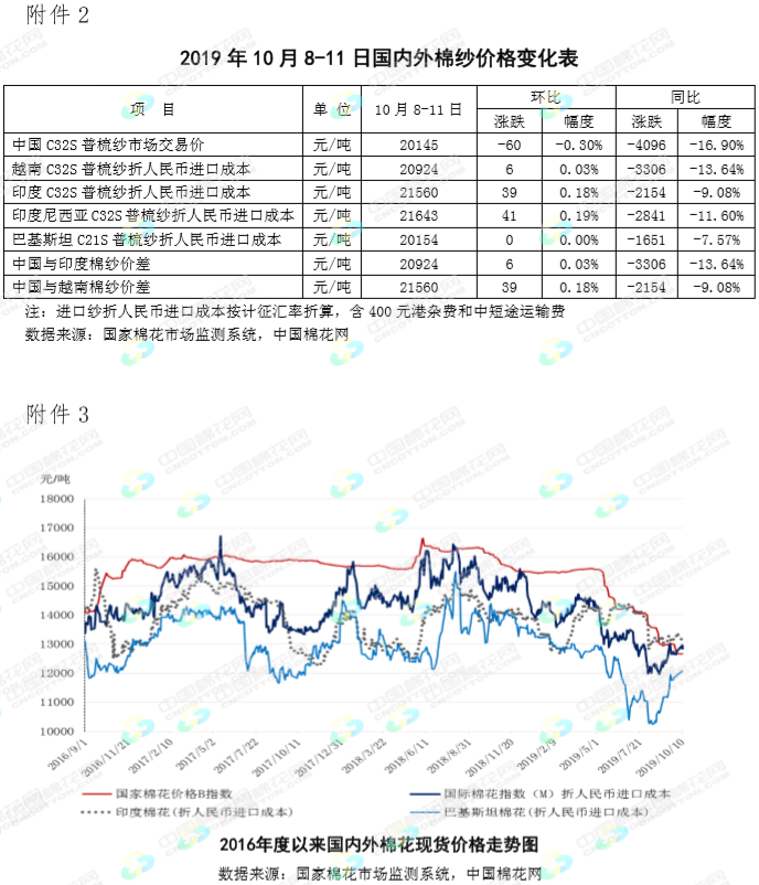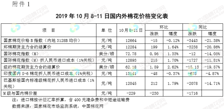 本周,受助于中美貿(mào)易談判憧憬,國際棉價上漲。2019年10月8-11日,紐約棉花期貨主力合約結(jié)算價62.18美分/磅,較上周上漲1.59美分/磅,漲幅2.62%,代表進(jìn)口棉中國主港到岸均價的國際棉花指數(shù)(M)72.78美分/磅,較上周上漲0.96美分/磅,漲幅1.33%,折人民幣進(jìn)口成本12893元/噸,較上周上漲215元/噸,漲幅1.70%;國際棉價高于國內(nèi)棉價229元/噸,與上周形成反差。