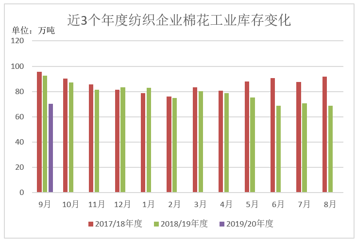 本月市場行情有所好轉,加上企業(yè)原料庫存普遍較低,補庫積極性有所提高,原料庫存整體略有上升。截至9月30日紡織企業(yè)棉花庫存量70.14萬噸,較上月底上升1.41萬噸,同比減少22.33萬噸。其中22%企業(yè)減少棉花庫存,37%增加庫存,41%基本保持不變。