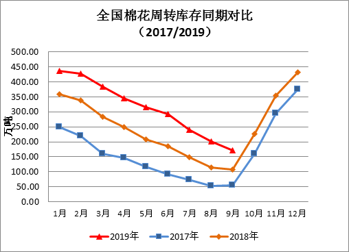 9月,中美貿(mào)易摩擦出現(xiàn)緩和,市場(chǎng)預(yù)期略有好轉(zhuǎn),儲(chǔ)備棉輪出成交量有所提高。新棉即將上市,市場(chǎng)資源充裕,紡織企業(yè)堅(jiān)持隨用隨買(mǎi),月末中國(guó)棉花商業(yè)庫(kù)存繼續(xù)下降。據(jù)中國(guó)棉花協(xié)會(huì)棉花物流分會(huì)對(duì)全國(guó)18個(gè)省市的164家棉花交割和監(jiān)管倉(cāng)庫(kù)調(diào)查數(shù)據(jù)顯示:9月底全國(guó)棉花周轉(zhuǎn)庫(kù)存總量約171.32萬(wàn)噸,較上月減少29.54萬(wàn)噸,同比仍高64.04萬(wàn)噸,但這一差距較上月收窄22.76萬(wàn)噸。