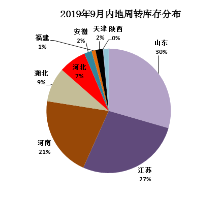 從各省庫(kù)存分布情況看:山東省庫(kù)存量居首位,為17.32萬(wàn)噸,江蘇省次之15.98萬(wàn)噸,河南省居第三位12.23萬(wàn)噸,湖北省5.27萬(wàn)噸,河北省4.22萬(wàn)噸,安徽省和天津市均為1.14萬(wàn)噸,其他省在萬(wàn)噸以下。