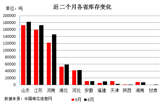 截至9月底內(nèi)地商品棉周轉(zhuǎn)庫(kù)存58.77萬(wàn)噸,環(huán)比減少4.91萬(wàn)噸;含新疆棉49.05萬(wàn)噸,已通關(guān)進(jìn)口棉2.14萬(wàn)噸,地產(chǎn)棉7.58萬(wàn)噸。