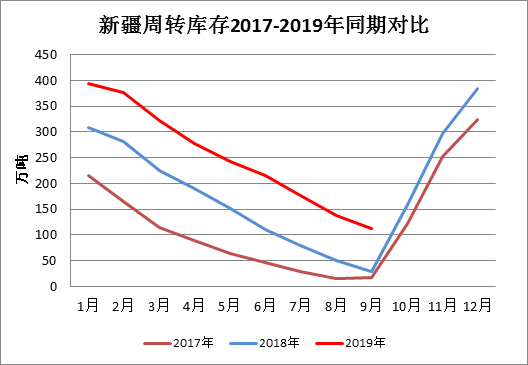 截至9月底新疆區(qū)內(nèi)43家倉(cāng)庫(kù)商品棉周轉(zhuǎn)庫(kù)存112.55萬(wàn)噸,環(huán)比減少24.63萬(wàn)噸,高于去年同期84.06萬(wàn)噸。