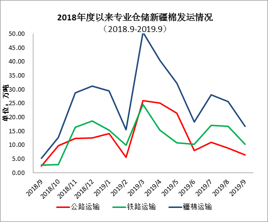 2019年1-9月出疆棉公路與鐵路共發(fā)運(yùn)256.78萬(wàn)噸,同比增加15.78萬(wàn)噸。
