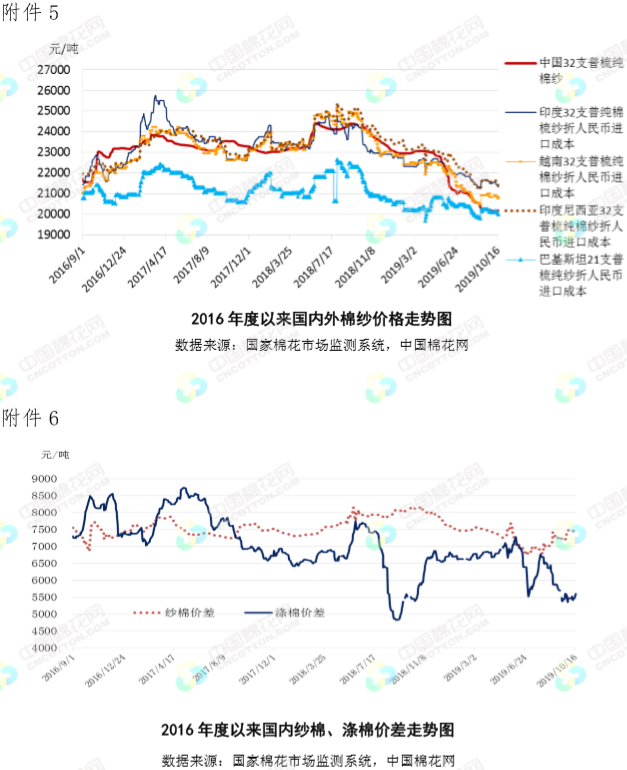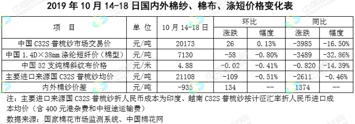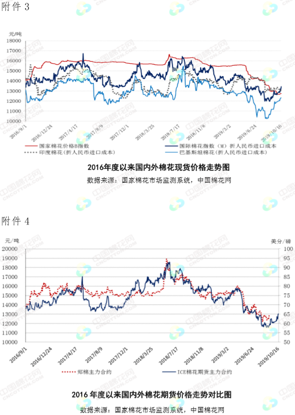 本周,受美元指數(shù)下跌和中國將增加自美國農(nóng)產(chǎn)品訂購消息提振,國際棉價繼續(xù)上漲。2019年10月14-18日,紐約棉花期貨主力合約結(jié)算價64.09美分/磅,較上周上漲1.91美分/磅,漲幅3.07%,代表進(jìn)口棉中國主港到岸均價的國際棉花指數(shù)(M)74.81美分/磅,較上周上漲2.03美分/磅,漲幅2.79%,折人民幣進(jìn)口成本13242元/噸,較上周上漲349元/噸,漲幅2.71%;國際棉價高于國內(nèi)棉價510元/噸,價差較上周縮小281元/噸。