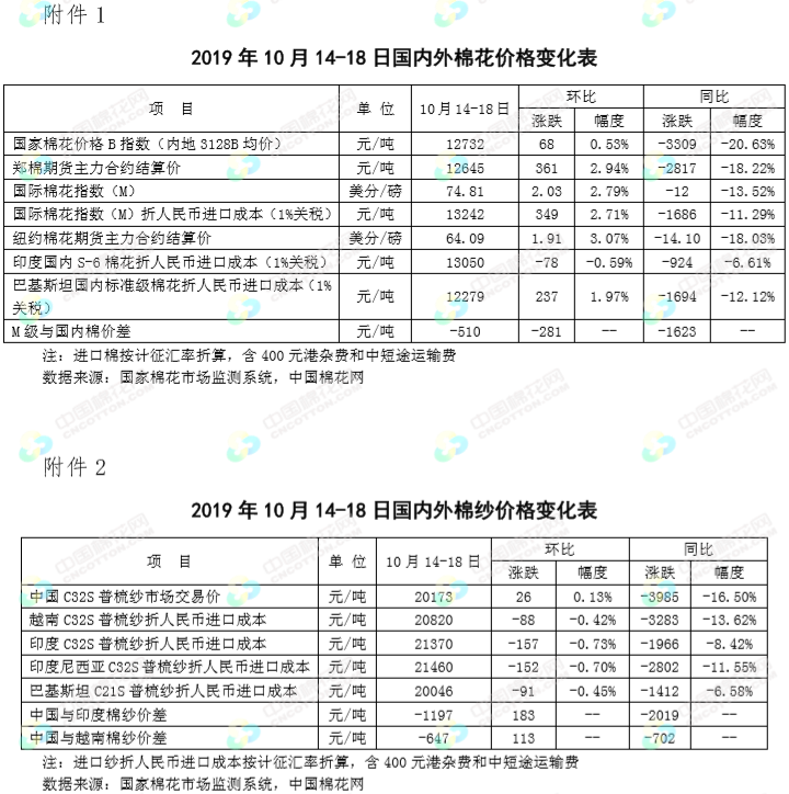本周,受國內(nèi)新疆棉區(qū)減產(chǎn)消息影響,國內(nèi)棉價有所上漲。2019年10月14-18日,代表內(nèi)地標(biāo)準(zhǔn)級皮棉銷售價格的國家棉花價格B指數(shù)均價12732元/噸,較上周上漲68元/噸,漲幅0.53%;鄭州棉花期貨主力合約結(jié)算均價12645元/噸,較上周上漲361元/噸,漲幅2.94%。