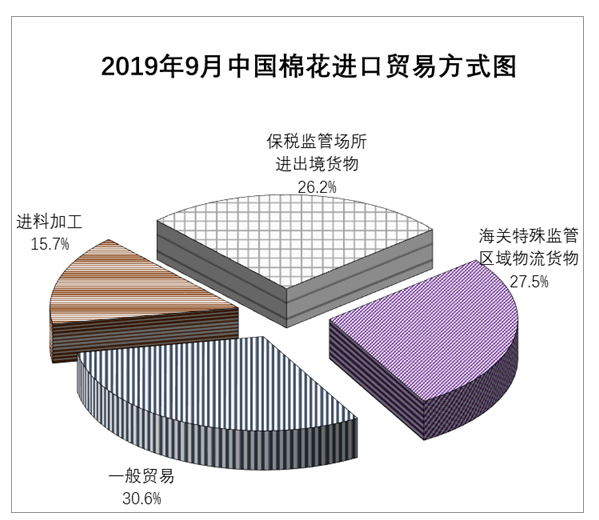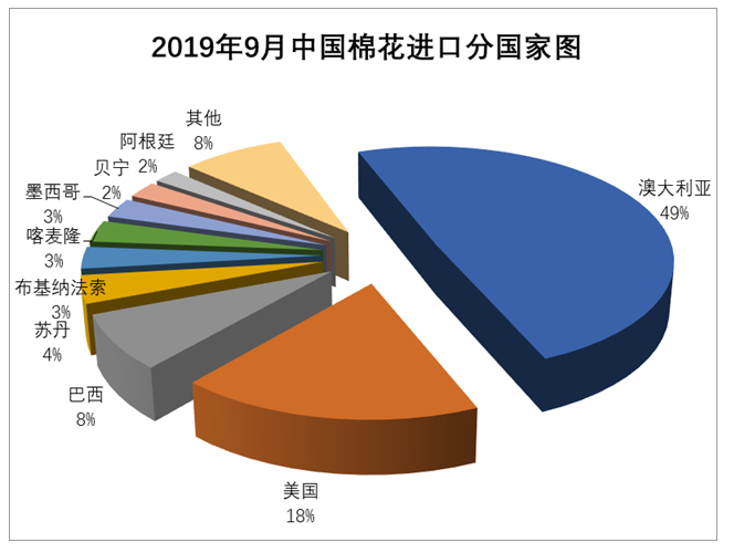 9月我國棉花進(jìn)口數(shù)量環(huán)比同比均持續(xù)回落。貿(mào)易方式中,一般貿(mào)易占比居第一位,海關(guān)特殊監(jiān)管區(qū)域物流貨物和保稅監(jiān)管場所進(jìn)出境貨物基本相當(dāng),分別排在第二第三位;來源國中,澳大利亞棉最多,比例接近5成,美國、巴西排在其后。