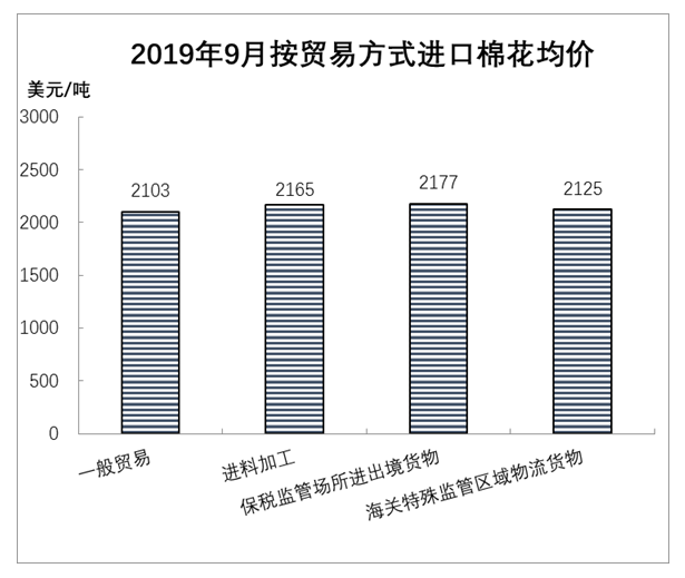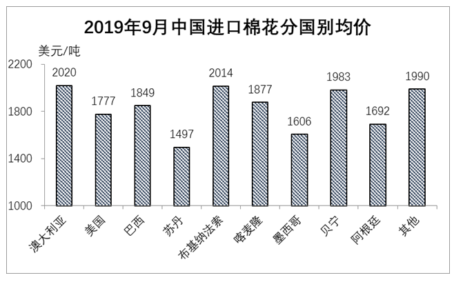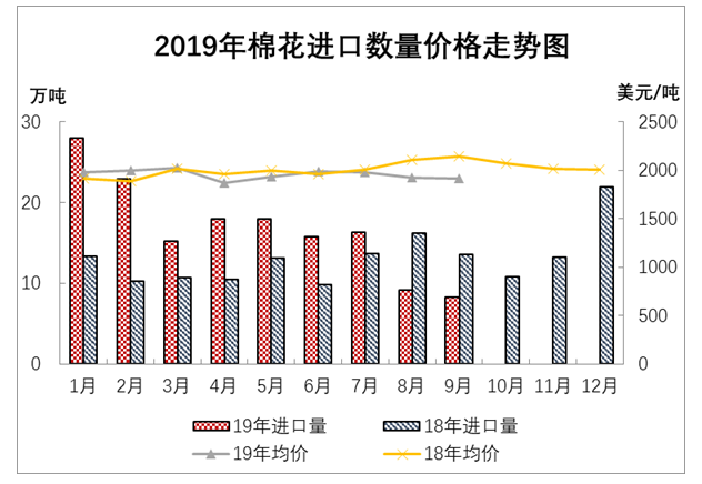 據(jù)海關(guān)統(tǒng)計,9月我國進(jìn)口棉花8.33萬噸,較上月減少9.3%,同比減少38.4%;平均進(jìn)口價格1917美元/噸,較8月下跌8美元,跌幅0.4%,同比下跌10.7%。1-9月我國進(jìn)口棉花151.75萬噸,同比增長36.3%。