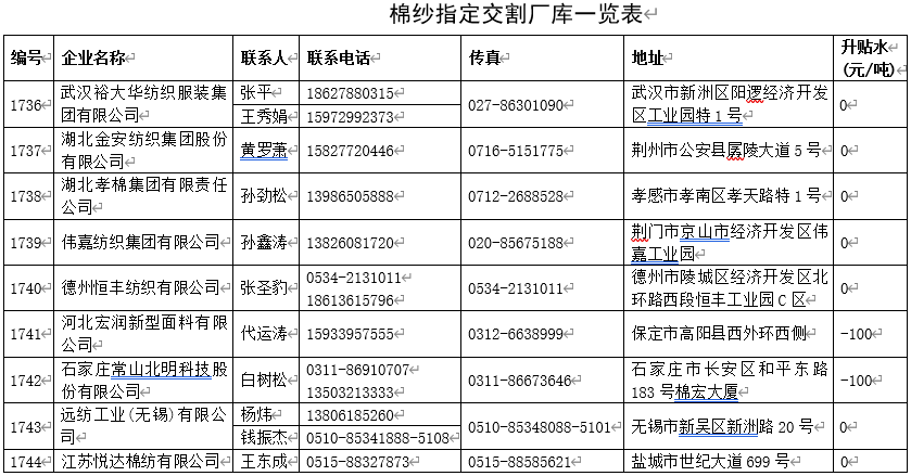 增設(shè)以下企業(yè)為棉紗指定交割廠庫:武漢裕大華紡織服裝集團(tuán)有限公司、湖北金安紡織集團(tuán)股份有限公司、湖北孝棉集團(tuán)有限責(zé)任公司、偉嘉紡織集團(tuán)有限公司、德州恒豐紡織有限公司、河北宏潤新型面料有限公司、石家莊常山北明科技股份有限公司、遠(yuǎn)紡工業(yè)(無錫)有限公司、江蘇悅達(dá)棉紡有限公司。