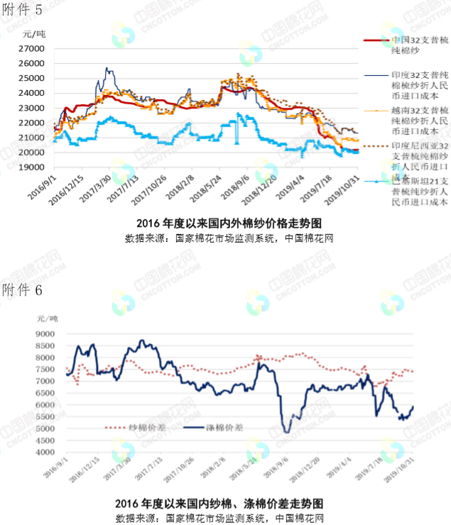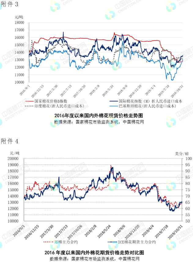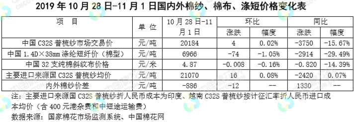 本周,市場期待中美貿易關系的進一步明朗,國際棉價漲勢趨緩。2019年10月28日-11月1日,紐約棉花期貨主力合約結算價64.78美分/磅,較上周上漲0.03美分/磅,漲幅0.05%,代表進口棉中國主港到岸均價的國際棉花指數(shù)(M)76.24美分/磅,較上周上漲0.35美分/磅,漲幅0.47%,折人民幣進口成本13487元/噸,較上周上漲61元/噸,漲幅0.45%;國際棉價高于國內棉價686元/噸,價差較上周擴大4元/噸。
