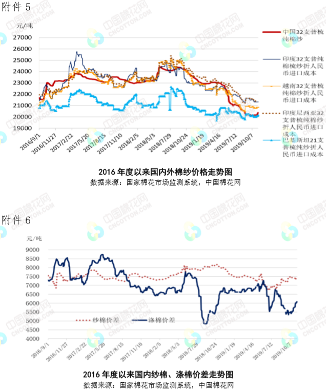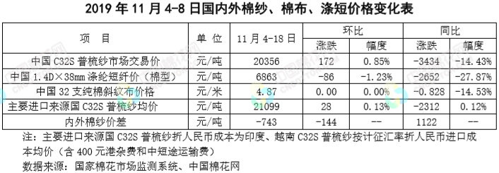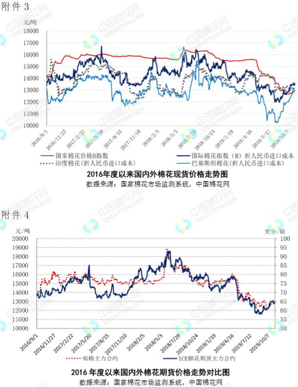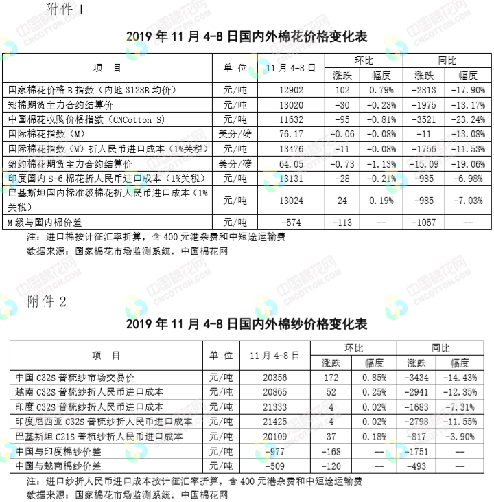 本周,受中美表示同意隨協(xié)議進展分階段取消加征關(guān)稅消息提振,國內(nèi)棉花現(xiàn)貨價格保持堅挺,但隨著新花上市量增加,期貨套保壓力較大,鄭棉振蕩下行,籽棉收購價有所回落。2019年11月4-8日代表內(nèi)地標準級皮棉銷售價格的國家棉花價格B指數(shù)均價12902元/噸,較上周上漲102元/噸,漲幅0.79%;鄭州棉花期貨主力合約結(jié)算均價13020元/噸,較上周下跌30元/噸,跌幅0.23%;代表全國主產(chǎn)棉省(區(qū))白棉3級籽棉折皮棉均價的中國棉花收購價S指數(shù)11632元/噸,較上周下降75元/噸,降幅0.81%。