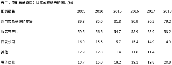 第三,盡管電子商務成長相當迅速,但日本消費者主要仍在實體服裝店購物。如表2所示,成衣主要是透過傳統(tǒng)和新形式通路組合來販賣。但盡管電子商務的競爭日益激烈,傳統(tǒng)以實體店為銷售型態(tài)的零售商(如服裝專賣店和百貨公司)在日本市場中仍扮演著主導地位。截至2018年日本消費者在實體店購買將近80%服裝。相較之下,同年在日本只有20%服裝是透過網絡銷售,遠低于鄰近其他亞洲市場,如中國(32%)、韓國(29%)。日本獨特的消費文化和社會規(guī)范可能會促進實體服裝店表現(xiàn)持續(xù)強勁。