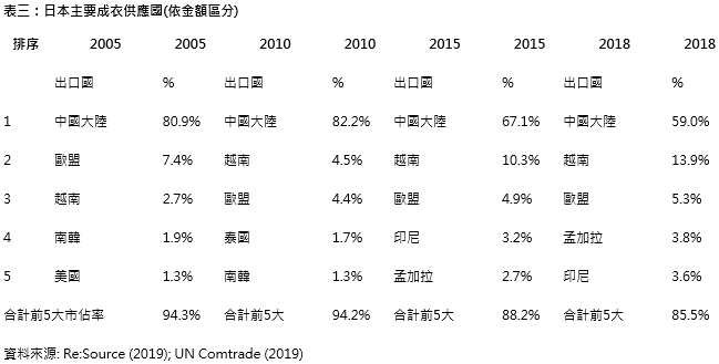 亞洲區(qū)域性貿易集團日益壯大,也為來自世界其他對日本市場感興趣的成衣供貨商帶來獨特的挑戰(zhàn)。截至2018年日本進口成衣只有7.5%來自非亞洲國家(主要是西歐盟國家),相較于2000年11.4%著實有顯著的下降。