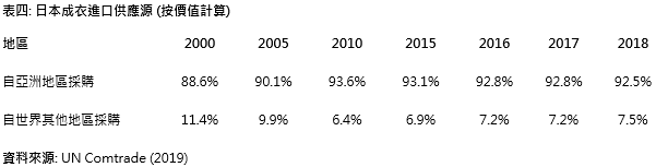 第三,有越來越多的日本時裝企業(yè)自亞洲地區(qū)采購。如表四所示,由于區(qū)域經濟更深度整合和區(qū)域紡織成衣供應鏈更趨有效,日本成衣自亞洲地區(qū)進口的比例越來越大。