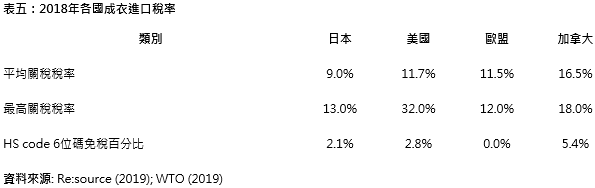 總體而言,與其他主要進口國相比,日本對于成衣設置較低的關稅壁壘。如如表五所示,日本在2018年對成衣產品適用的平均稅率(第61章針織和62章梭織)為9%,低于美國(11.7%)、歐盟(11.5%)、加拿大(16.5%)設定的關稅稅率。同時其最高適用稅率為13%,也低于美國的32%、加拿大的18.0%。