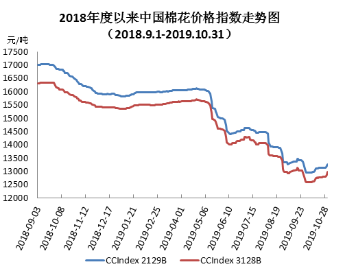 10月中美談判進(jìn)展順利貿(mào)易摩擦趨緩,有利于經(jīng)濟(jì)預(yù)期穩(wěn)定,對(duì)市場(chǎng)信心有明顯提振。隨著新棉大量上市,國(guó)內(nèi)庫(kù)存量依然較大,市場(chǎng)資源供應(yīng)充裕。紡企需求進(jìn)一步好轉(zhuǎn),棉花現(xiàn)貨價(jià)格平穩(wěn)上漲。月末中國(guó)棉花價(jià)格指數(shù)(CCIndex3128B)12971元/噸,較上月末上漲363元;月均價(jià)12962元/噸,環(huán)比下跌239元,同比下跌3237元。