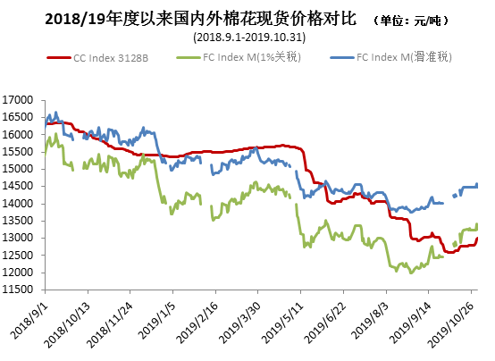 10月中美貿(mào)易摩擦趨緩,月底美聯(lián)儲(chǔ)年內(nèi)三度降息,國(guó)際棉花期現(xiàn)貨價(jià)格震蕩上漲,下旬外棉現(xiàn)貨價(jià)格反超國(guó)內(nèi)棉價(jià),價(jià)差逐漸加大。中國(guó)進(jìn)口棉價(jià)格指數(shù)FCIndexM月均75.27美分/磅,環(huán)比漲4.02美分/磅。月末77美分/磅,高于上月末4.69美分/磅,1%關(guān)稅下折人民幣13418元/噸,高于同期國(guó)內(nèi)現(xiàn)貨447元/噸,較前上月末反向擴(kuò)大494元/噸。