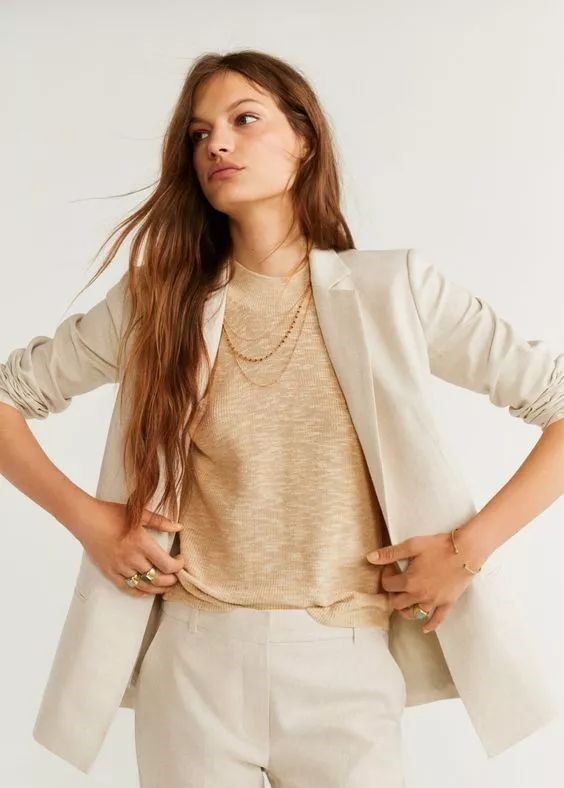 氣溫較低的時(shí)候,亞麻西裝可以內(nèi)搭毛衫,知性氣質(zhì),溫度與風(fēng)度并存。