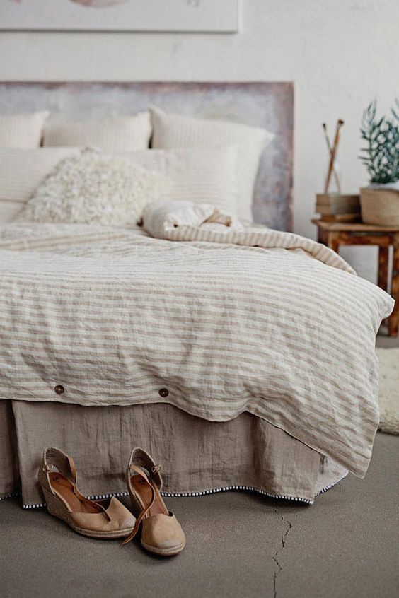 臥室是身心休息的場(chǎng)所,不宜選擇過(guò)于強(qiáng)烈的色彩和圖案,淺色細(xì)條紋是不錯(cuò)的推薦。被子或床單,一繁一簡(jiǎn),細(xì)狀條紋縱橫延伸,低調(diào)不張揚(yáng),如同置身田園鄉(xiāng)間。亞麻面料的吸濕透氣性,給皮膚持久干爽舒適。夏天用涼爽,冬天用能排出床褥濕氣,倍感溫暖。