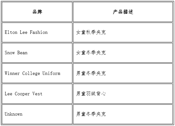 此次召回產(chǎn)品涉及多種型號的兒童夾克。夾克帶有抽繩、紐扣等。具體召回產(chǎn)品信息如下: