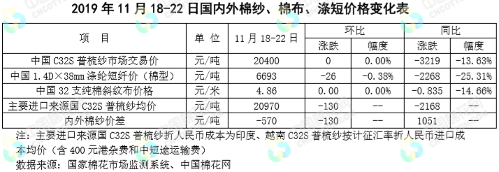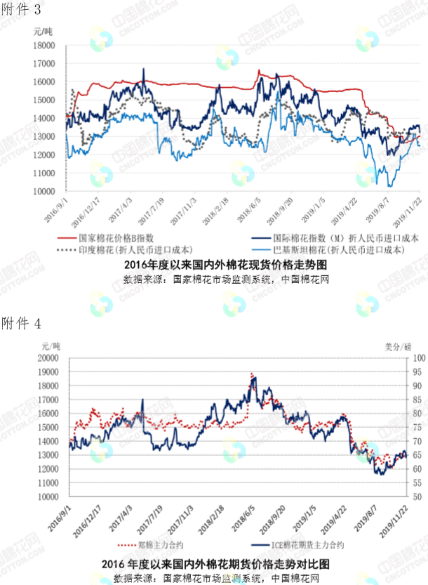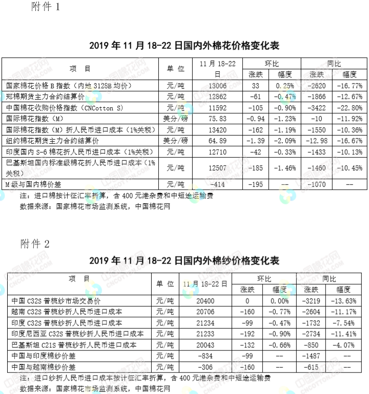 本周,中美貿(mào)易關(guān)系不確定性上升,鄭棉振蕩下行;受新疆棉輪入時(shí)間臨近提振,皮棉現(xiàn)貨價(jià)格保持堅(jiān)挺。2019年11月18-22日代表內(nèi)地標(biāo)準(zhǔn)級(jí)皮棉銷售價(jià)格的國(guó)家棉花價(jià)格B指數(shù)均價(jià)13600元/噸,較上周上漲33元/噸,漲幅0.25%;鄭州棉花期貨主力合約結(jié)算均價(jià)12862元/噸,較上周下跌61元/噸,跌幅0.47%;代表全國(guó)主產(chǎn)棉省(區(qū))白棉3級(jí)籽棉折皮棉均價(jià)的中國(guó)棉花收購(gòu)價(jià)格S指數(shù)11592元/噸,較上周下跌105元/噸,跌幅0.9%。