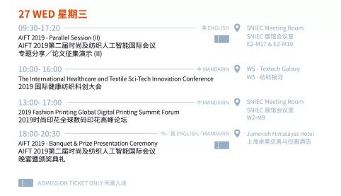 11月27日舉辦的活動包括第二屆時尚及紡織人工智能國際會議 (AIFT 2019)、2019 國際健康紡織科創(chuàng)大會及2019時尚印花全球數(shù)碼印花高峰論壇,全面聚焦「人工智能」、「健康紡織」及「數(shù)碼印花」的未來趨勢。