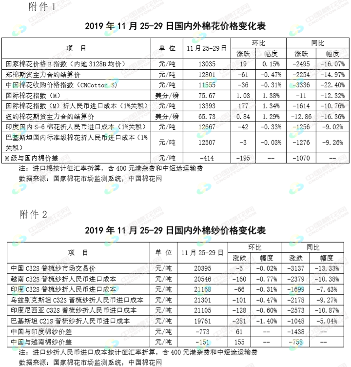 本周,儲備棉輪入時間臨近,國內(nèi)棉花現(xiàn)貨價格堅挺;受累于中美貿(mào)易磋商疑慮,鄭棉弱勢振蕩為主。2019年11月25-29日代表內(nèi)地標準級皮棉銷售價格的國家棉花價格B指數(shù)均價13035元/噸,較上周上漲19元/噸,漲幅0.15%;鄭州棉花期貨主力合約結(jié)算均價12801元/噸,較上周下跌61元/噸,跌幅0.47%;代表全國主產(chǎn)棉省(區(qū))白棉3級籽棉折皮棉均價的中國棉花收購價格S指數(shù)均價11555元/噸,較上周下跌36元/噸,跌幅0.31%。