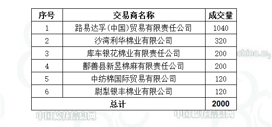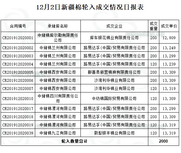 12月2日,中國(guó)儲(chǔ)備棉管理有限公司計(jì)劃采購(gòu)新疆棉7000噸,實(shí)際成交2000噸,成交率28.57%,成交均價(jià)13259元/噸,成交最高價(jià)13319元/噸,成交最低價(jià)12909元/噸。其中新疆庫(kù)成交200噸、內(nèi)地庫(kù)成交1800噸。