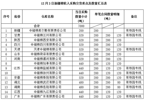 中國儲備棉管理有限公司定于2019年12月3日采購新疆棉7000噸(公定重量),最高限價13319元/噸(標準級3128價格)。具體庫點及數(shù)量如下: