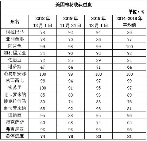 12月2日美國農(nóng)業(yè)部發(fā)布的美國棉花生產(chǎn)報告顯示,截至2019年12月1日美國棉花收獲進(jìn)度83%,較前周增加5個百分點(diǎn),比去年同期增加9個百分點(diǎn),比過去5年同期增加2個百分點(diǎn)。