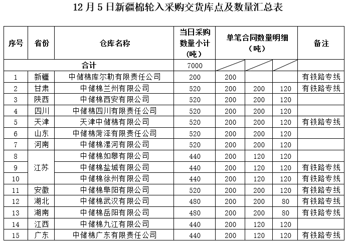 中國儲備棉管理有限公司定于2019年12月5日采購新疆棉7000噸(公定重量),最高限價13319元/噸(標準級3128價格)。具體庫點及數(shù)量如下: