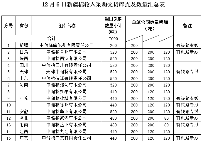 中國儲備棉管理有限公司定于2019年12月6日采購新疆棉7000噸(公定重量),最高限價13319元/噸(標(biāo)準(zhǔn)級3128價格)。具體庫點及數(shù)量如下:
