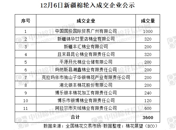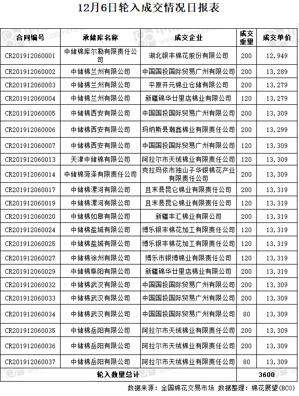 12月6日,中國儲備棉管理有限公司計劃采購新疆棉7000噸,實際成交3600噸,成交率51.43%,成交均價13288元/噸,較5日漲103元/噸,成交最高價13319元/噸,較5日持平,成交最低價12949元/噸,較5日漲50元/噸。其中新疆庫成交200噸、內(nèi)地庫成交3400噸。