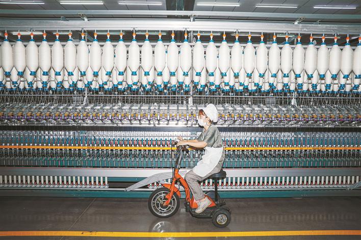 ▲12月4日,在位于兵團(tuán)草湖廣東紡織服裝產(chǎn)業(yè)園的東純興紡織有限公司車(chē)間里,員工騎三輪車(chē)穿梭其間,排查處理故障。