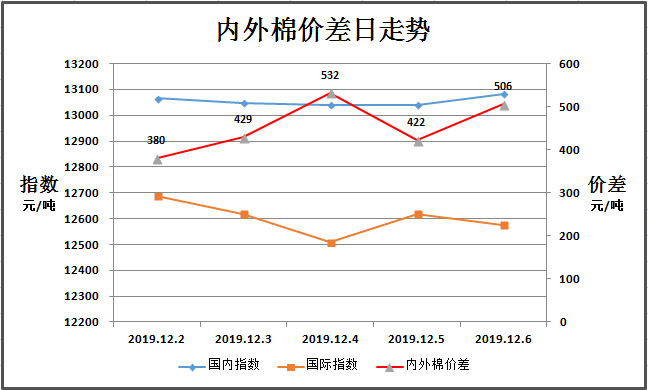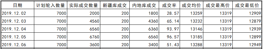 上周(2019年12月2-6日)是2019年度新疆棉輪入首周,中國儲備棉管理有限公司計劃采購新疆棉3.5萬噸,實際成交2.348萬噸,最高限價13319元/噸,成交均價13222元/噸,最高成交價13319元/噸,最低成交價12879元/噸。內(nèi)外棉價差380-532元/噸,未達到800元/噸警戒線。