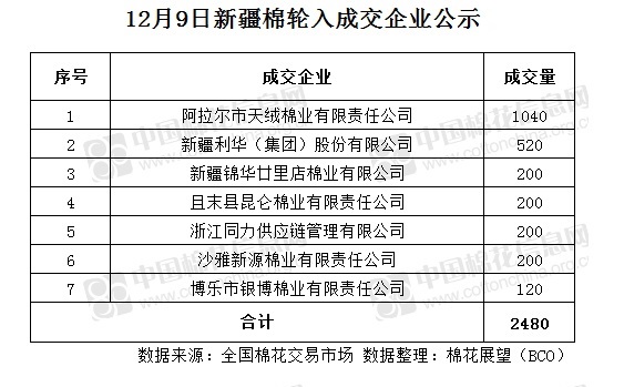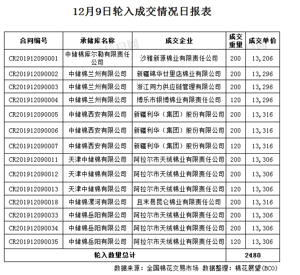 12月9日,中國(guó)儲(chǔ)備棉管理有限公司計(jì)劃采購(gòu)新疆棉7000噸,實(shí)際成交2480噸,成交率35.43%,成交均價(jià)13299元/噸,較6日漲11元/噸,成交最高價(jià)13316元/噸,較6日跌3元/噸,成交最低價(jià)13206元/噸,較6日漲257元/噸。 其中新疆庫(kù)成交200噸,內(nèi)地庫(kù)成交2280噸。