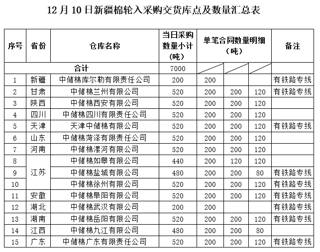 中國儲備棉管理有限公司定于2019年12月10日采購新疆棉7000噸(公定重量),最高限價13316元/噸(折標準級3128B價格)。具體庫點及數(shù)量如下: