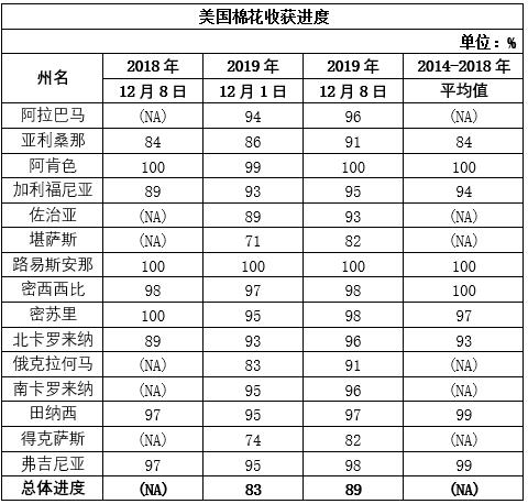 12月9日美國農(nóng)業(yè)部發(fā)布的美國棉花生產(chǎn)報告顯示,截至2019年12月8日美棉收獲進度89%,較前周增加6個百分點,除堪薩斯州和得克薩斯州以外,其他地區(qū)收獲已基本結(jié)束。