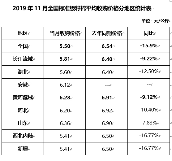 據(jù)統(tǒng)計(jì),截止到11月30日,全國400型棉花加工企業(yè)3128級籽棉平均收購價(jià)5.50元/公斤,同比下降15.90%。新疆籽棉收購價(jià)5.41元/公斤,同比下降16.77%;長江流域籽棉收購價(jià)5.81元/公斤,同比下降9.22%;黃河流域收購價(jià)6.28元/公斤,同比下降9.12%。