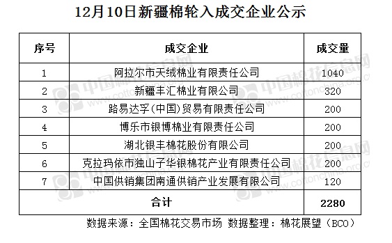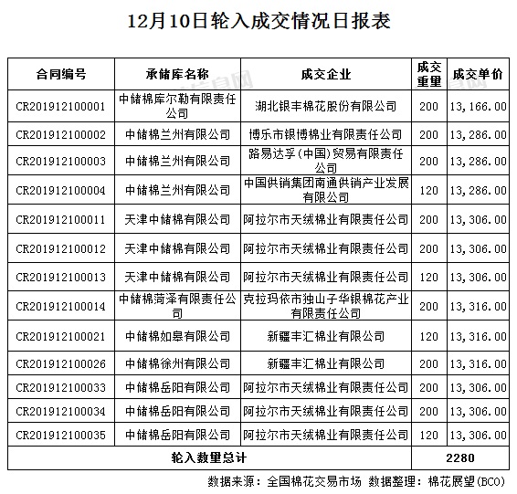 12月10日,中國儲備棉管理有限公司計劃采購新疆棉7000噸,實際成交2280噸,成交率32.57%,成交均價13291元/噸,較9日跌8元/噸,成交最高價13316元/噸,較9日持平,成交最低價13166元/噸,較9日跌40元/噸。 其中新疆庫成交200噸,內(nèi)地庫成交2080噸。
