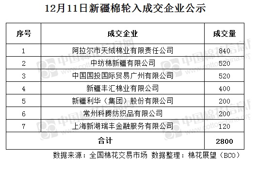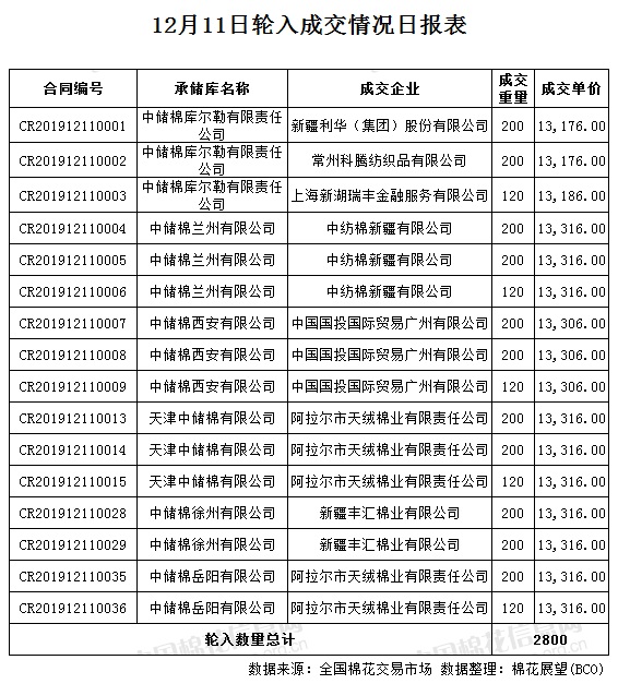 12月11日,中國(guó)儲(chǔ)備棉管理有限公司計(jì)劃采購新疆棉7000噸,實(shí)際成交2800噸,成交率40%,成交均價(jià)13289元/噸,較10日跌2元/噸,成交最高價(jià)13316元/噸,較10日持平,成交最低價(jià)13176元/噸,較10日漲10元/噸。其中新疆庫成交520噸,內(nèi)地庫成交2280噸。