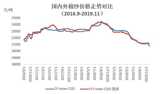 本月國內(nèi)棉紗價格略有上漲,而進口棉紗價格繼續(xù)下跌。據(jù)調(diào)查,國產(chǎn)32支純棉紗11月均價21185元/噸,較上月上升73元/噸,漲幅0.35%,較去年同期下跌2583元/噸,跌幅10.87%;進口32支純棉紗月均價21171元/噸,較上月下跌21元/噸,跌幅0.1%,較去年同期下跌2516元/噸,跌幅10.6%。
