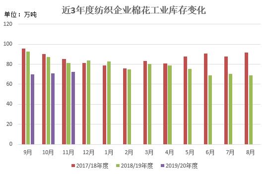 本月市場行情有所好轉(zhuǎn),加上紡紗企業(yè)原料庫存普遍較低,補庫積極性有所提高,棉花庫存整體略有上升。截至11月31日紡織企業(yè)棉花庫存量72.32萬噸,較上月底上升1.36萬噸,同比減少14.33萬噸。其中18%企業(yè)減少棉花庫存,38%增加庫存,44%基本保持不變。