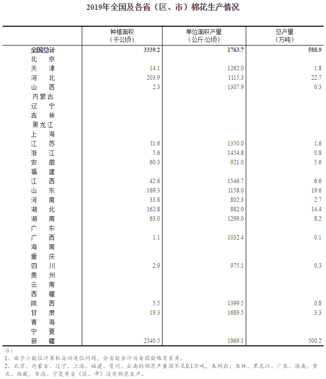 三、全國(guó)棉花總產(chǎn)量588.9萬(wàn)噸,比2018年減少21.3萬(wàn)噸,下降3.5%。