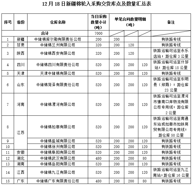 中國(guó)儲(chǔ)備棉管理有限公司定于2019年12月18日采購(gòu)新疆棉7000噸(公定重量),最高限價(jià)13425元/噸(折標(biāo)準(zhǔn)級(jí)3128B價(jià)格)。具體庫(kù)點(diǎn)及數(shù)量如下: